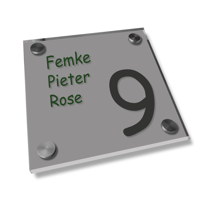 Naambord vervaardigd van een glasheldere plaat, waarvan de randen zijn gepolijst. Hierdoor bent u verzekerd van een zeer onderhoudsvriendelijk product. De achterzijde van het naambordje is afgewerkt met een kleurlaag. De RVS afstandhouders zorgen ervoor dat het naambordje 15 mm. vrij van de muur komt te hangen. Omdat de bedrukking wordt aangebracht op de (achterzijde van de) heldere plaat, ontstaat er een fraaie dieptewerking en krijgt het naambord een luxe uitstraling. Alle benodigde bevestigingsmaterialen (muurpluggen, afstandshouders en geslepen RVS sierdopjes) worden meegeleverd.