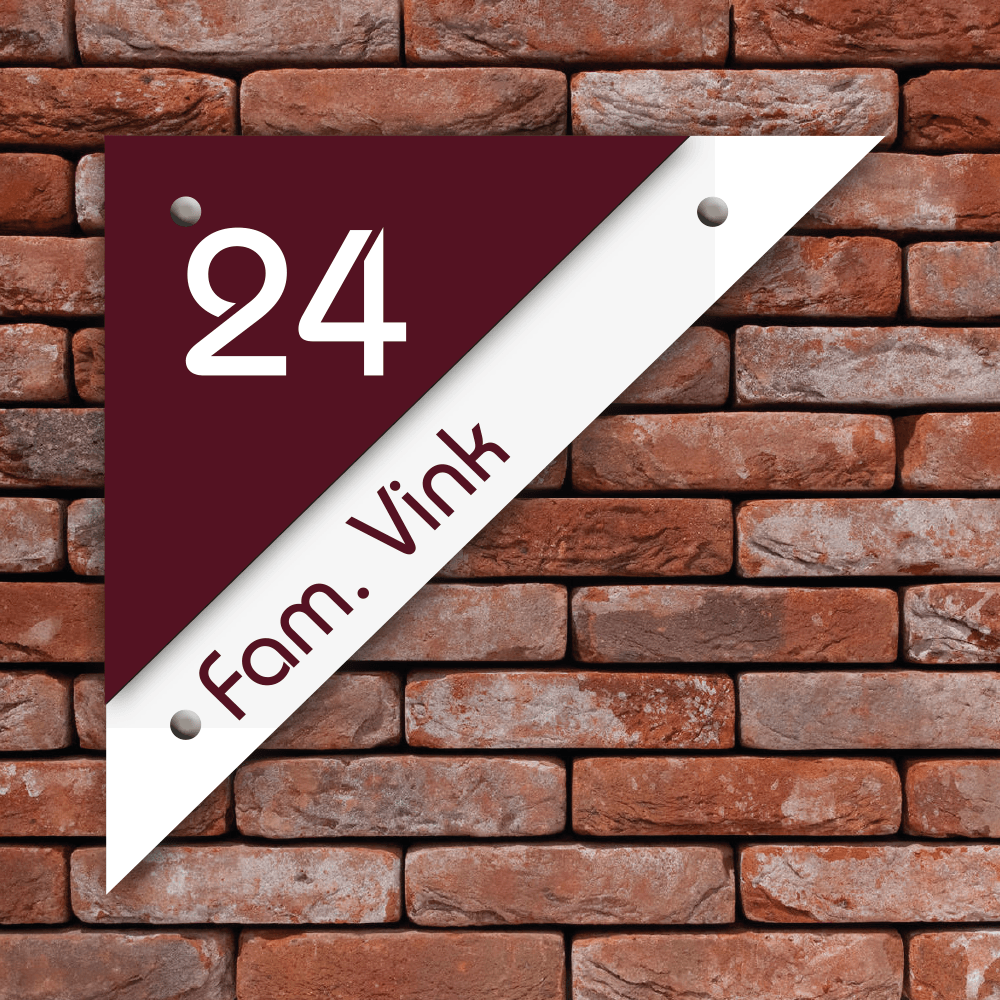 Kunststof naambordje in 2 verschillende kleuren. Bordje is in de vorm van een driehoek en wordt geleverd met een set voor de bevestiging. U bepaalt zelf de inhoud van dit bordje. Kleuren van dit naambordje zijn rood/wit.