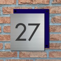 Luxe naambord bestaande uit een blauwe kunststof achterplaat waarop een geslepen RVS-look plaat is gemonteerd. Formaat 15x15 cm