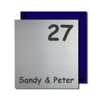Luxe naambord bestaande uit een blauwe kunststof achterplaat waarop een geslepen RVS-look plaat is gemonteerd. Formaat 20x20 cm