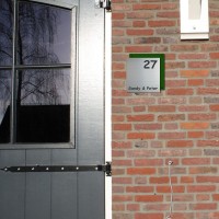Luxe naambord bestaande uit een groene kunststof achterplaat waarop een geslepen RVS-look plaat is gemonteerd. Formaat 20x20 cm