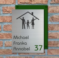Luxe naambord bestaande uit een groene kunststof achterplaat waarop een geslepen RVS-look plaat is gemonteerd. Formaat 20x25 cm