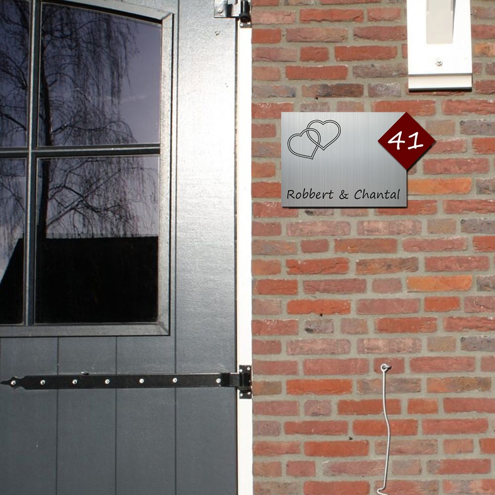 Naambordje RVS-look met rood acrylplaatje erop voor huisnummer. Afmeting 30x20cm. ✅ Indien voor 15.u besteld, dezelfde dag op de post.